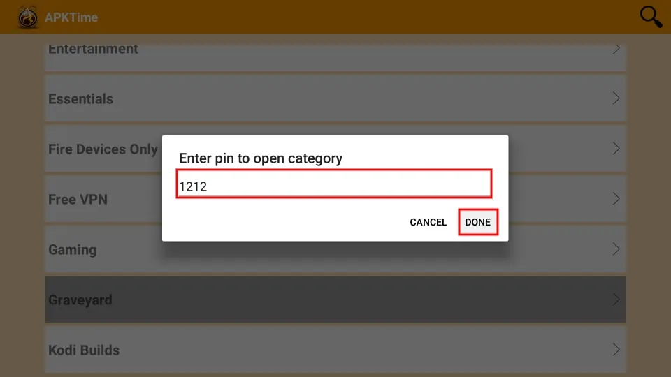 On the APKTime home screen, the Graveyard category houses apps that no longer receive updates but can still be installed. However, you need to type in a PIN to access the folder. The PIN is 1212.