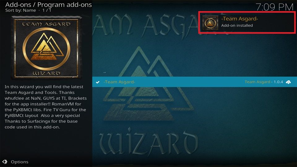 8. You will notice the prompt Team Asgard Add-on installed. Stay on the screen.