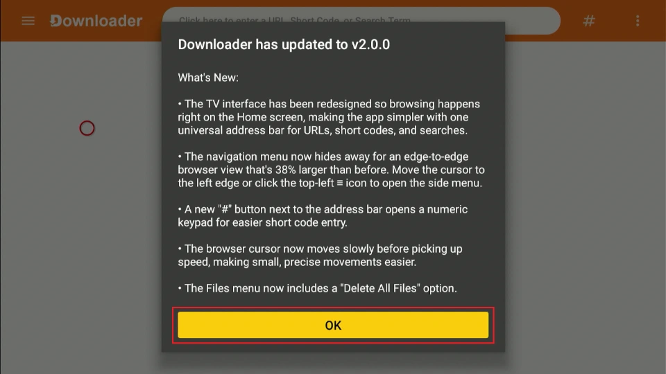 If you’ve enabled auto-updates on your device, no need to manually update the Downloader app. The app will auto-update because it is an official app. You’ll get a notification about the new update and what’s new. Click OK and continue using the updated version 2.0.