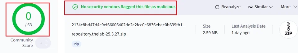 VirusTotal didn’t flag the Lab Repository zip file as malicious (last checked on June 10, 2025). See the screenshot below:
