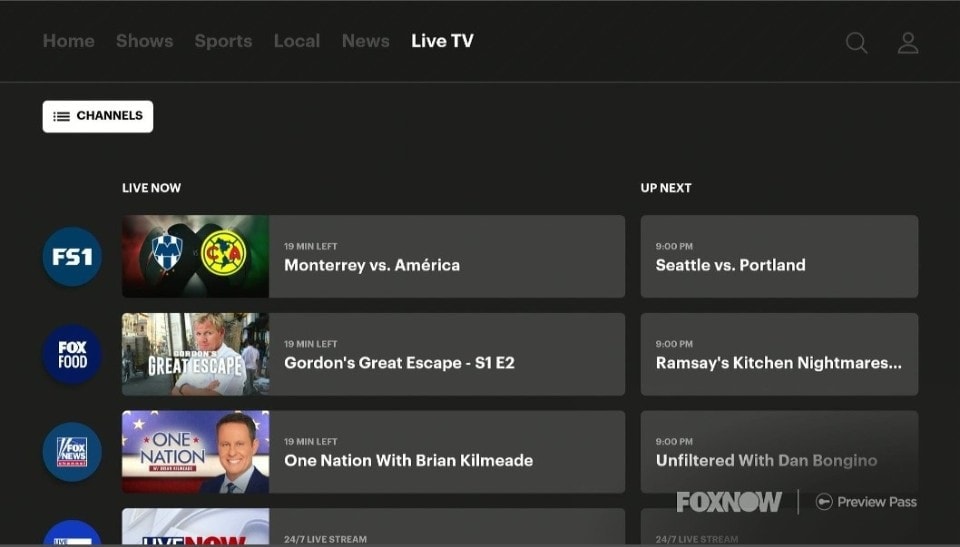 Another excellent Fox Now feature is the on-air Fox Live TV channels. You’ll find multiple Fox channels, including Fox Sports 1, Fox Food, Fox News, Fox Weather, Fox Sports 2, Fox Soul, and many others.