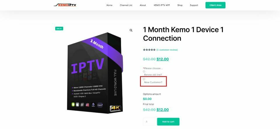 Kemo IPTV offers the following plans (all plans include 40,000+ VOD, 15,000+ cable TV channels, and 1 simultaneous connection. For plans with multiple connections, please explore the pricing section of the website):