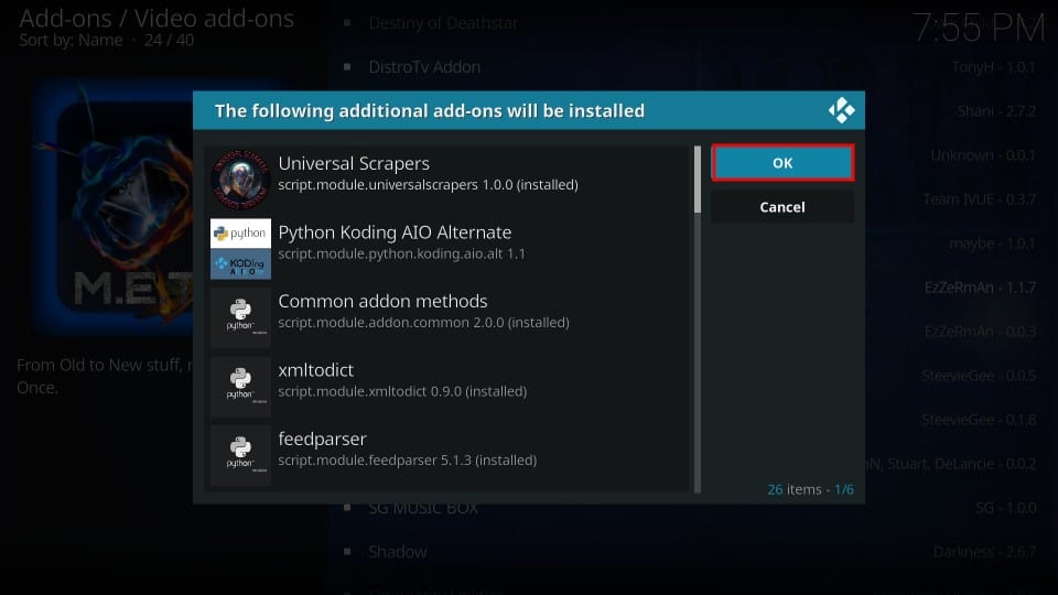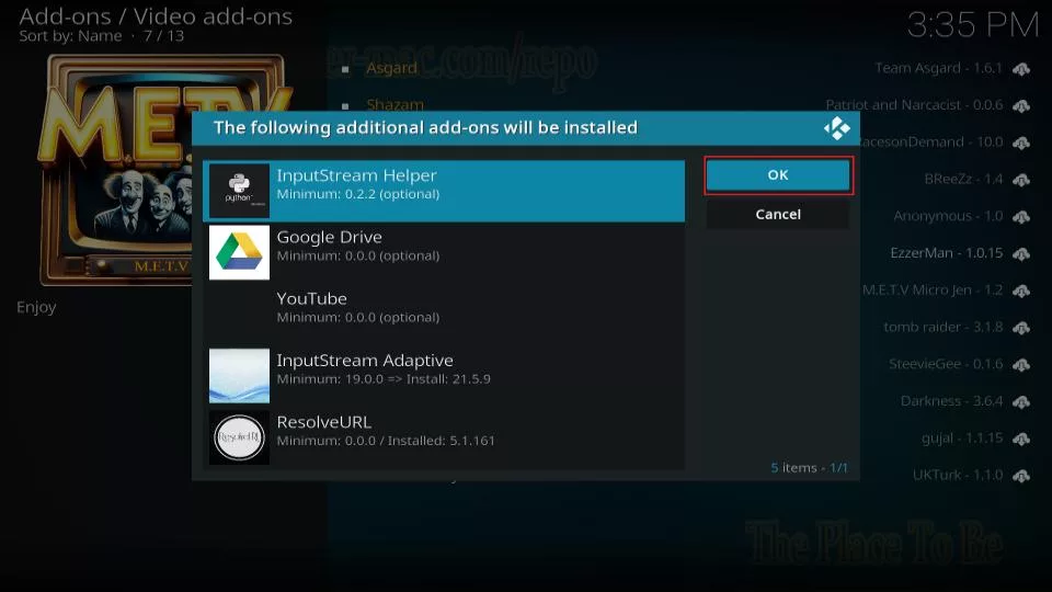 6. Click OK to install the additional addons shown in the pop-up. You need them for M.E.T.V to work.