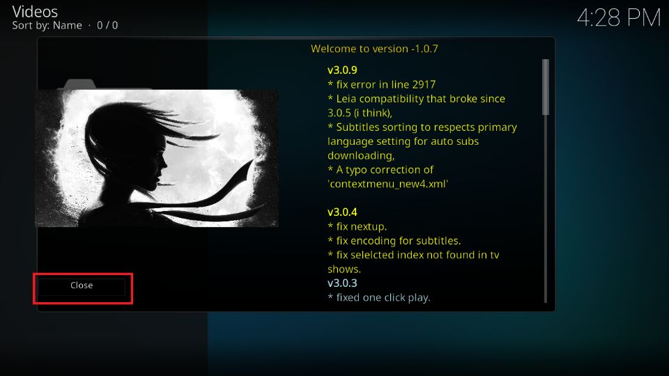 When you launch the M.E.T.V Kodi addon, a prompt will appear. Select Close.