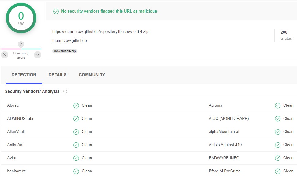 To corroborate further, I used Virus Total, a well-known web-based antivirus, to scan the repository. The following image shows the scan result. No vendor has flagged The Crew Repo as malicious.