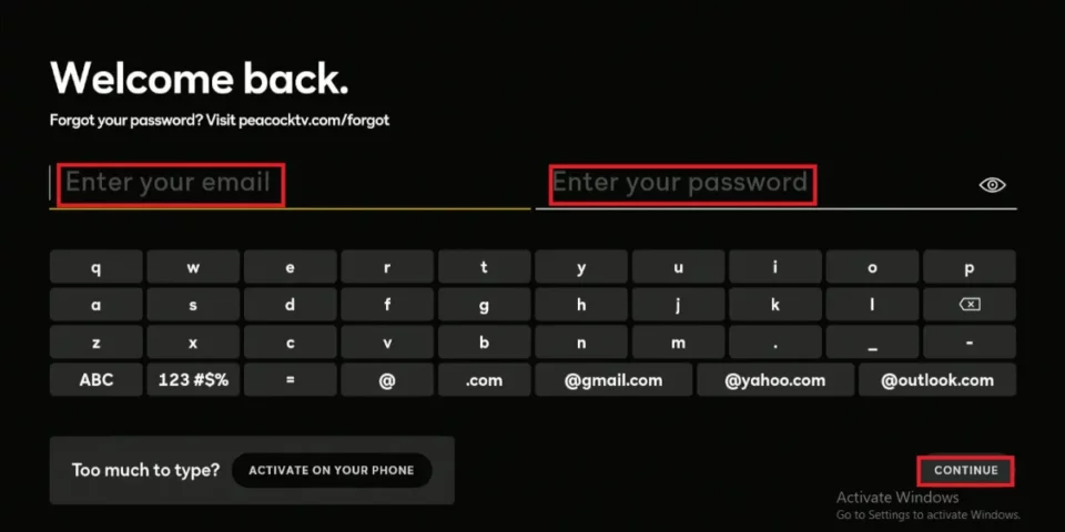 Enter your account email address and password, then click Continue to sign in to the Peacock TV app on FireStick.