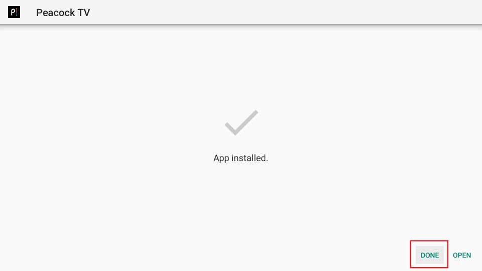 7. Wait for the Peacock TV to install on FireStick. This takes a few seconds. When this prompt is displayed, click DONE.