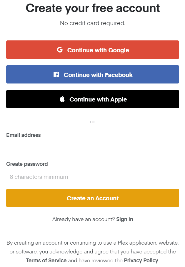 Before you install Plex on FireStick, you will want to sign up for an account if you don’t already have one. So, let’s first create a Plex account.