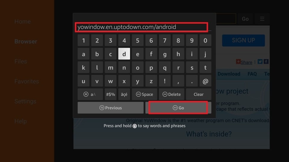 5. Enter the following yowindow.en.uptodown.com/android and click on Go.